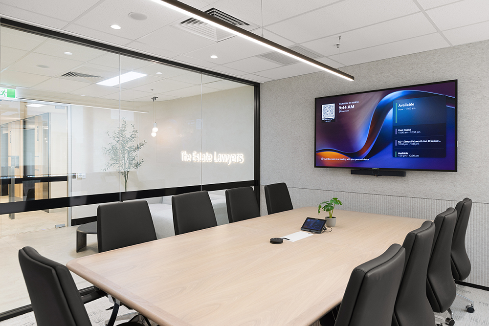 The boardroom includes ergonomic seating, integrated AV solutions, acoustic treatments, and sheer curtaining, balancing professionalism with privacy. -