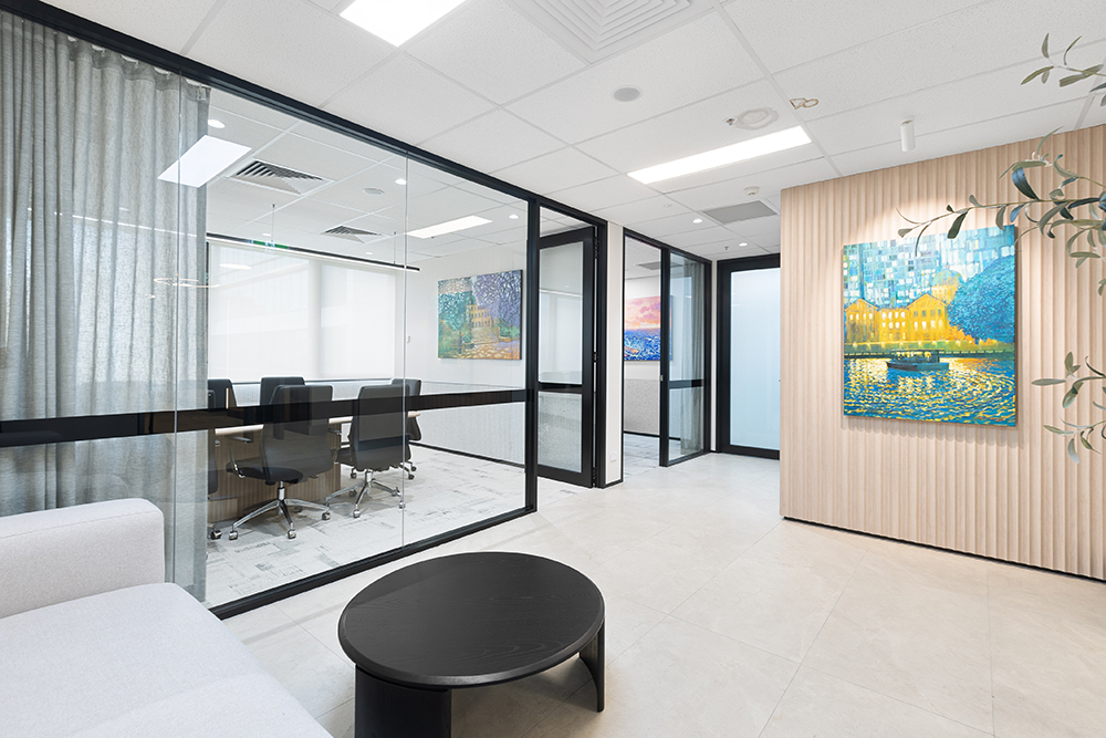 Glazed partitions provide clear sightlines and transparency while maintaining privacy, giving the space an open and structured feel. -