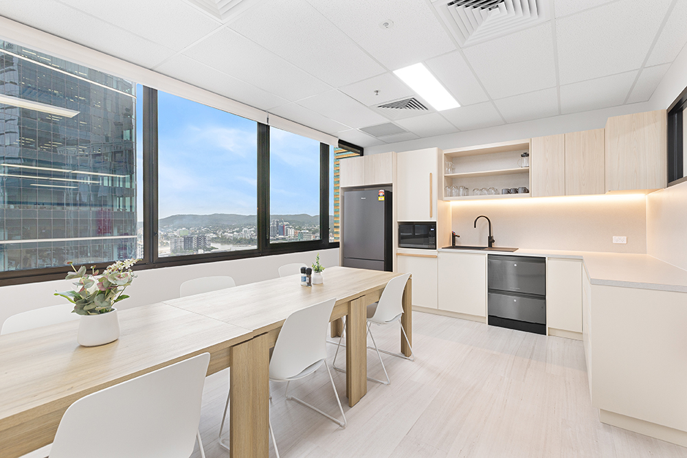 calming aesthetic. The kitchen breakout area, with sweeping views across Brisbane, includes seamless joinery, a large fridge, concealed appliances, and built-in LED lighting—designed not only for practical staff use but also as a quiet, inviting retreat.